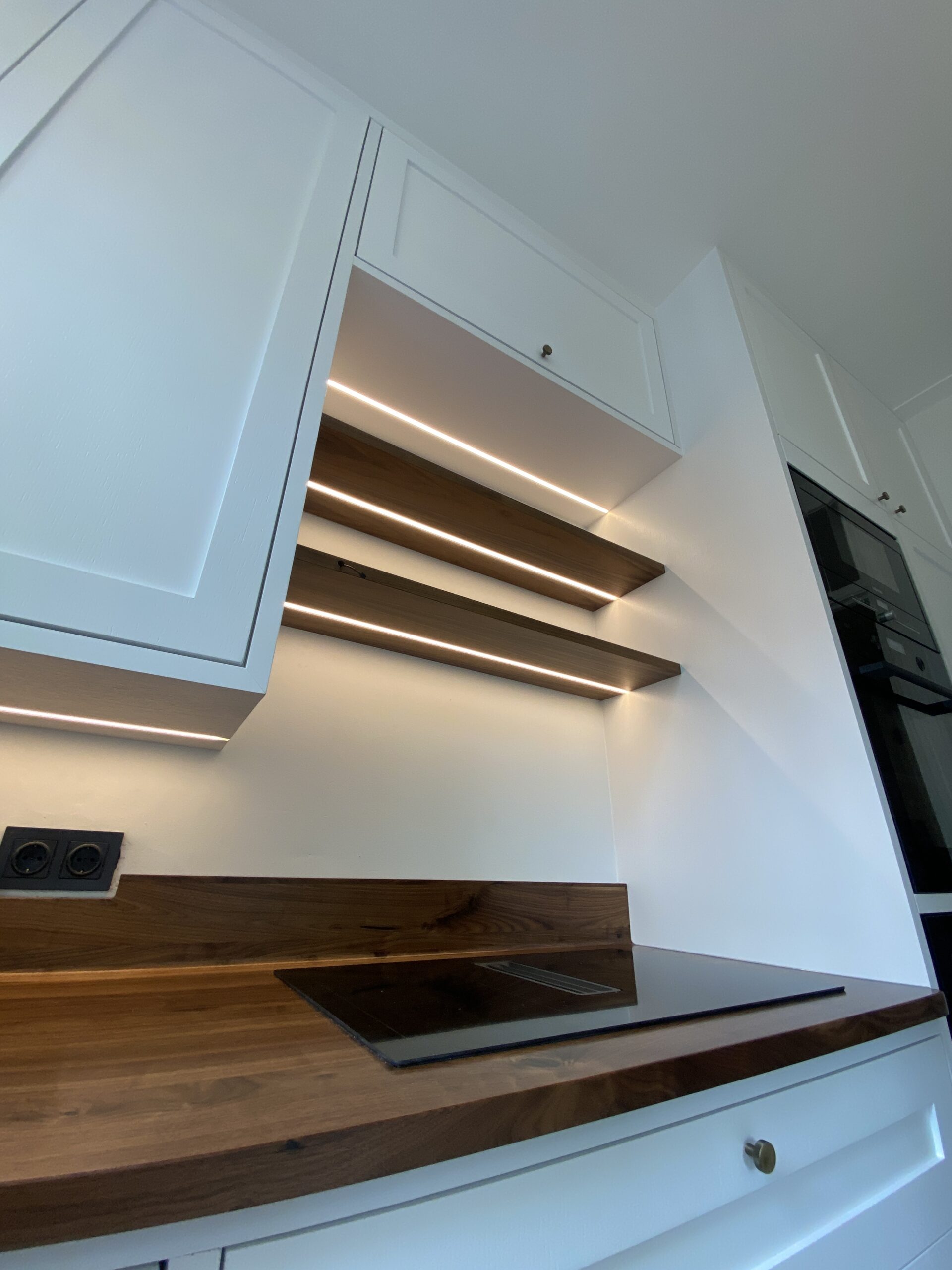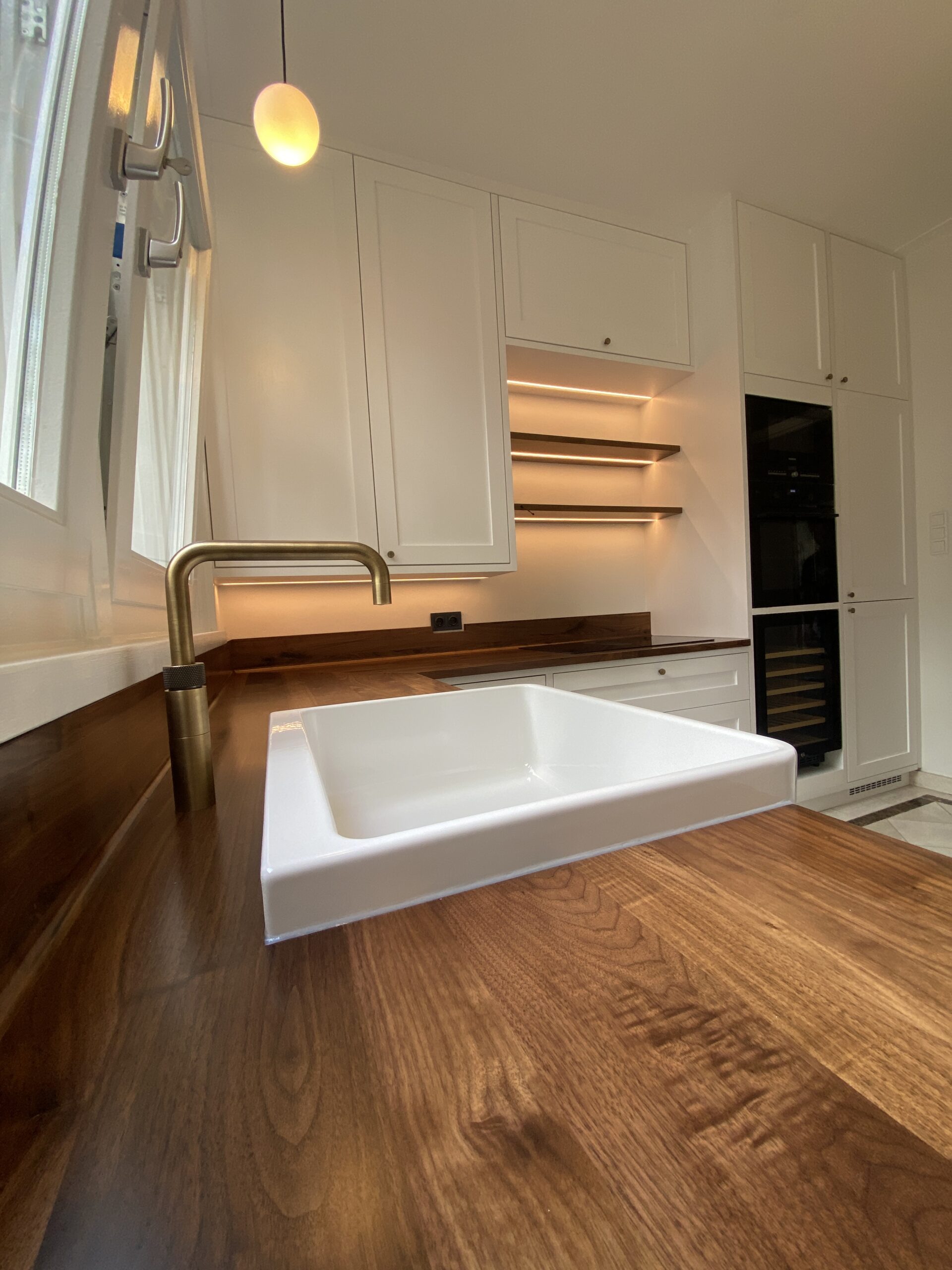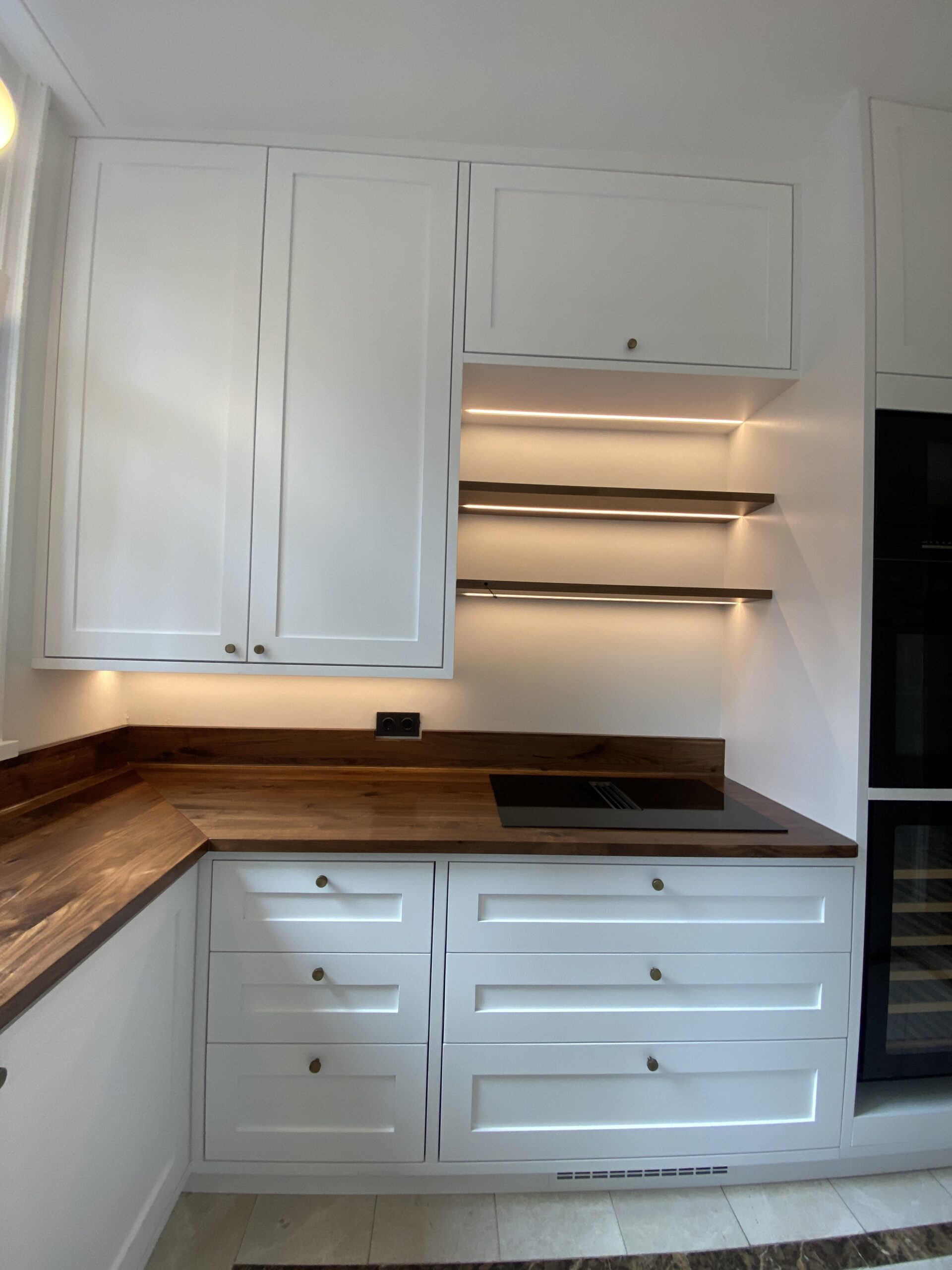 Onze eerste maatwerk keuken van A tot Z is een feit. Van muur tot muur en vloer tot plafond. De inliggende deuren van extra dik eiken fineer hebben een unieke uitstraling. Het massief notenhouten blad met ronde overloop in spatrand is de luxe eyecatcher van de keuken. De verlichting geeft de boel extra touch.